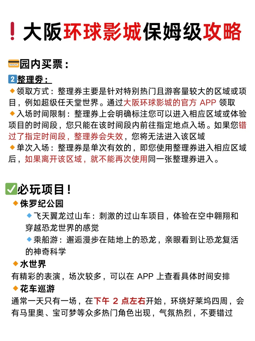 - 可以各种经验贴看看,部分活动有比较好的拍照时间。任天堂园区有好吃的餐食,可以安排在饭点(前提是你能预约得到吃饭)。