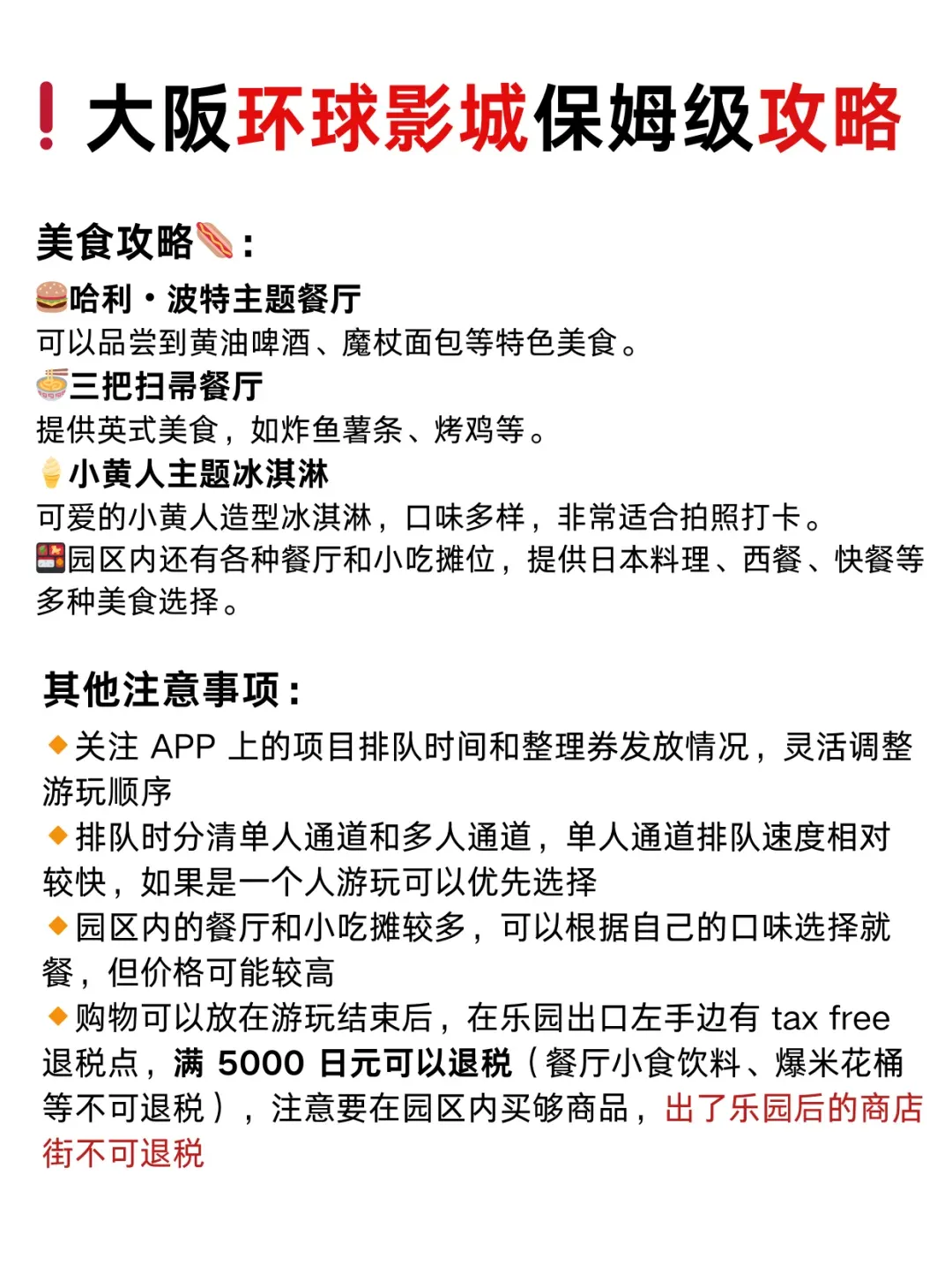 ⚠️其他注意事项: 购物可在游玩后,乐园出口左手边有退税点,满 5000 日元可退税(餐厅小食饮料等不可退) 花车巡游通常下午 2 点左右开始,不要错过