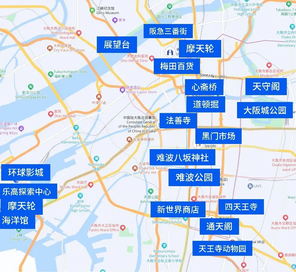 - 天王寺住宿推荐:天王寺位于大阪南部,是连接市区与关西机场的重要交通枢纽,对于搭乘早班机的旅客非常便利。天王寺周围有阿倍野近铁百货及新世界等知名景点,是一个消费相对亲民的区域。虽然这里的旅游设施不如难波或心斋桥繁华,但如果你想找平价大阪住宿,且不介意较为简单的设施,天王寺将会大阪住宿的好选择。